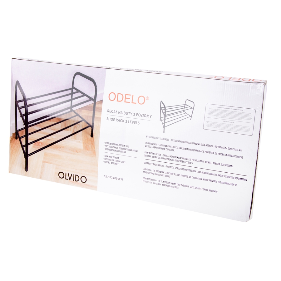 metalu. Dwa poziomy zapewniają praktyczne miejsce do przechowywania obuwia, a
