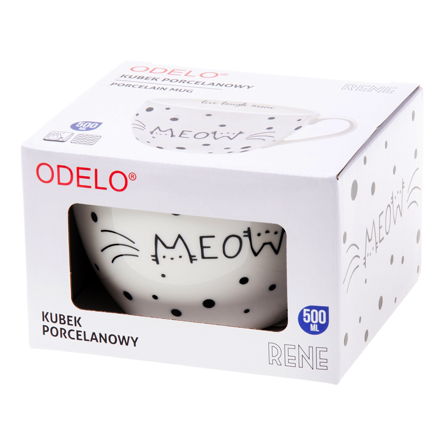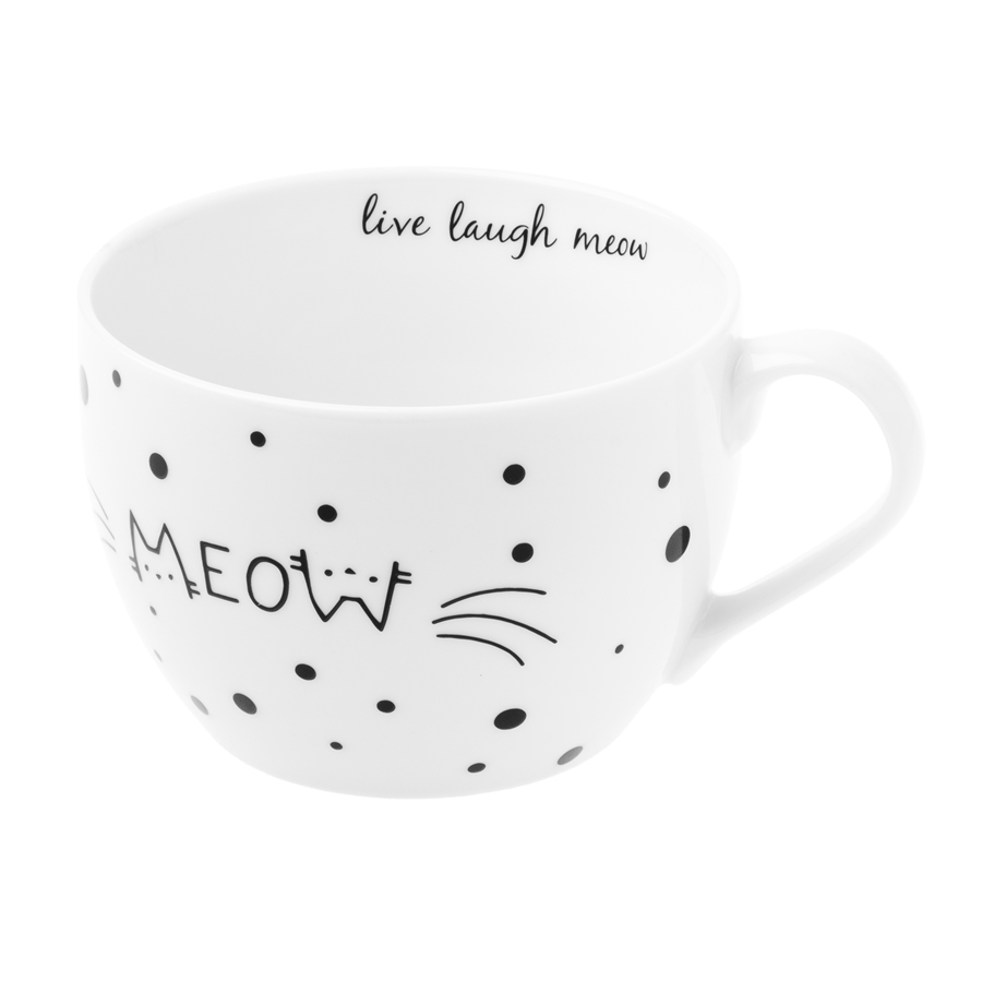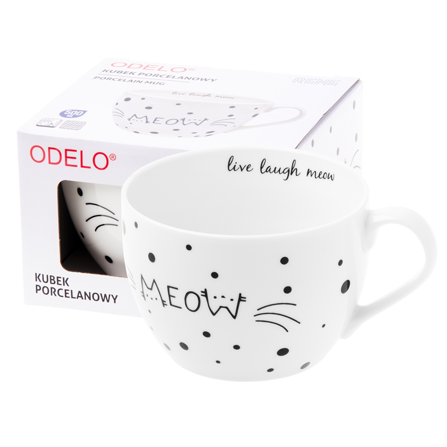 kubek w czystej bieli z uroczym motywem. Bezpieczny w mikrofali, można myć w